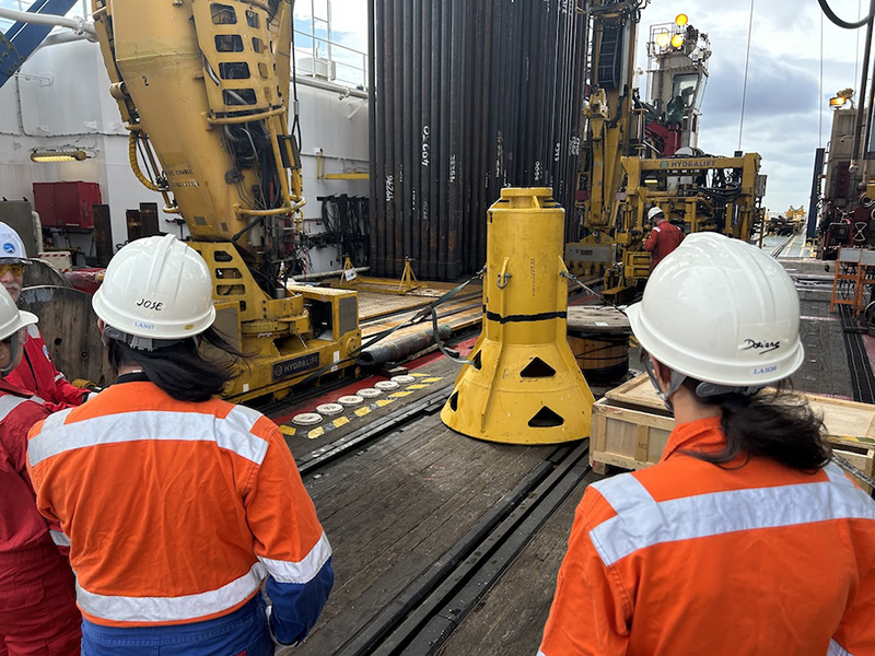 本航海で最初の陸上チームとのオンライン定例会を行いました。オペレーション中は、陸上との情報共有が重要となるため、平日は毎朝行われます。研究者向けに掘削同時検層(LWD:Logging While Drilling)講習や、本航海で最初のオンラインイベントとなる地質学会 J-DESC夜間小集会イベントとのライブ中継も実施しました。温度計の再設置に向けての準備も進んでいます。