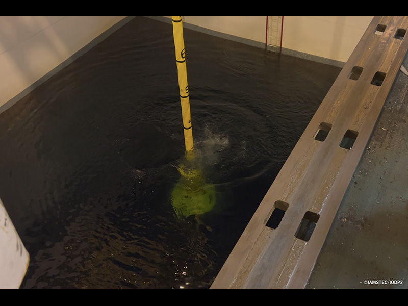「ちきゅう」は揚管を終え、掘削した孔内に設置するケーシングの組立て作業を進めています。このケーシング内に温度計が設置されます。ラボ作業はひと段落しましたが、研究者たちはそれぞれレポートの〆切と闘っている様子。昨日からのあられに続き、海上には竜巻がいくつか発生しています。まるで空も海を掘削しているようです。