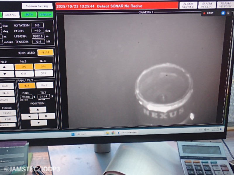 掘削目標地点を確認し、LWD掘進を開始しました。掘削と同時にリアルタイムでのデータ観測も順調に進みました。フェーズ1の温度計再設置の際は掘削孔を見つけるのにとても苦労しましたが、黒潮の影響下での手順が確立されたため、今ではスムーズに水中テレビカメラ(UWTV)で掘削孔を映像で捉えることができます。