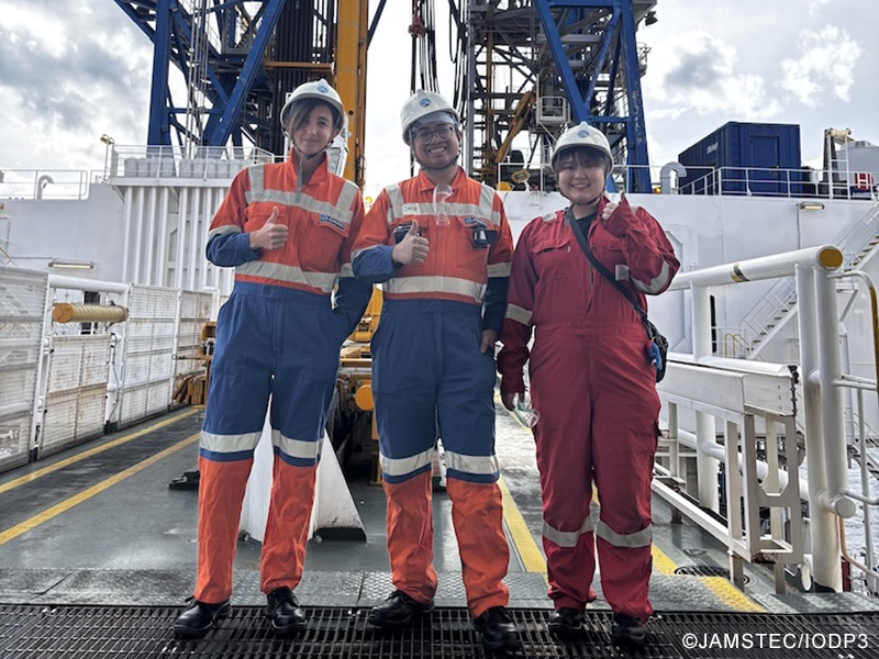 「ちきゅう」は明日10時に、東北沖での航海へ向けて出港予定です。2024年に実施の JTRACK で設置した温度計を回収・再設置します。出港前に、この航海の共同首席研究者(Co-Chief)と研究支援統括(EPM)で記念撮影を行いました。