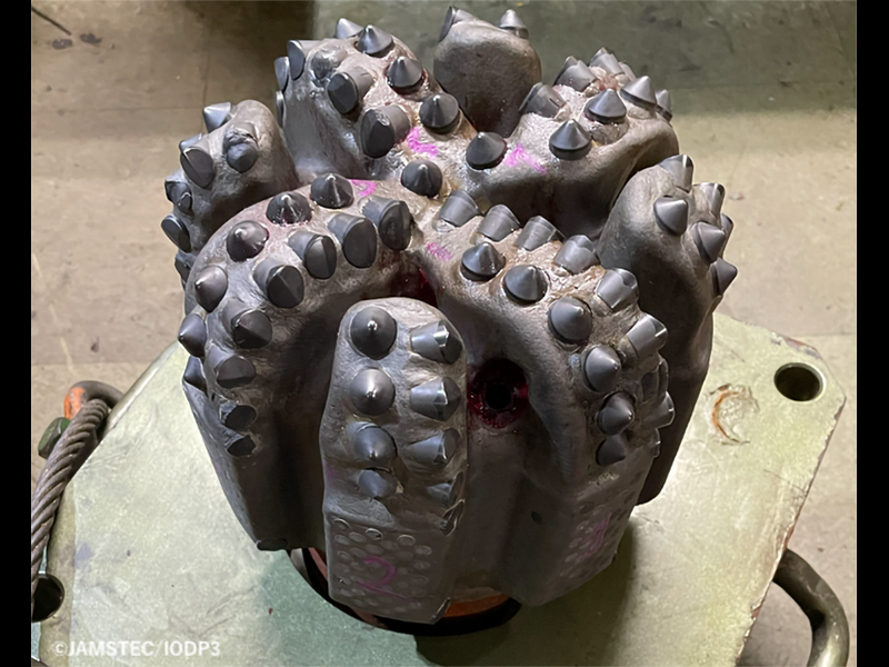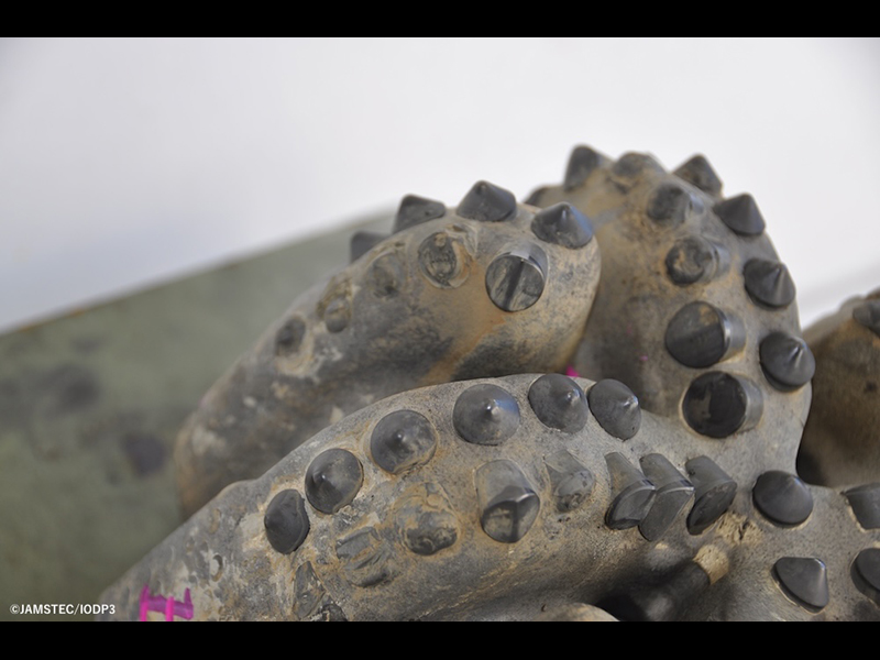 ドリルビットを確認したところ、相当奮闘してくれたらしく、だいぶ削れてしまっていました。頑張ってくれたドリルビットに感謝です。「ちきゅう」は海溝軸の陸側でのLWDとドリルパイプの揚管作業を終えたところで第2フェーズの前半が無事に終了しました。第2フェーズの後半は、海溝軸の海側でのLWDです。次の掘削に向け「ちきゅう」は移動を開始しました。