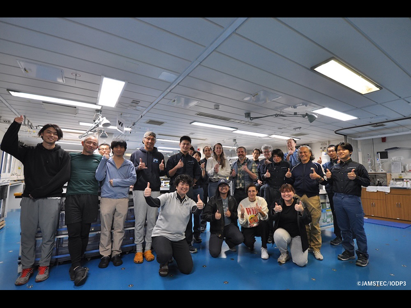 船上へのセンサー接続ツール揚管を終了し、第1フェーズ完了です。ラボでは研究者が専門分野のチームに分かれ、それぞれ異なるサンプルの処理作業を確認。掘削エンジニアの交代のためのヘリも無事に飛び立ちました。
