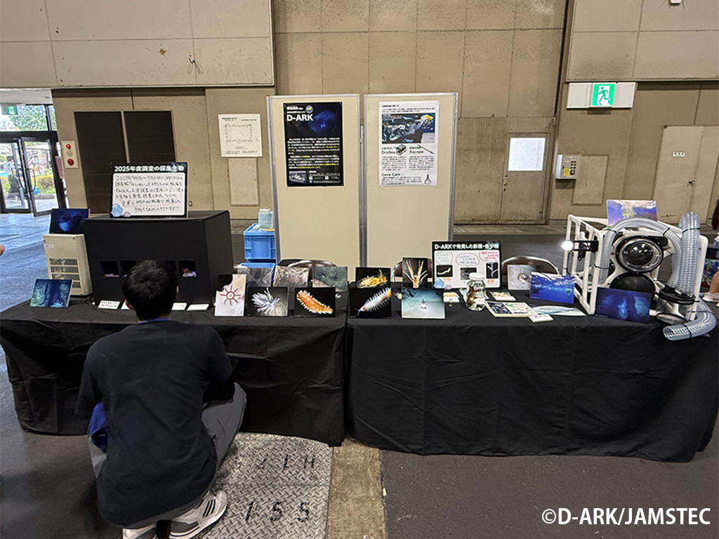 今回初めてD-ARKもブースを出展しました。新江ノ島水族館が中心となり、調査で採集してきた生物や貴重な生物標本の展示、D-ARKの調査には欠かせない水中ドローンの展示を行いました。