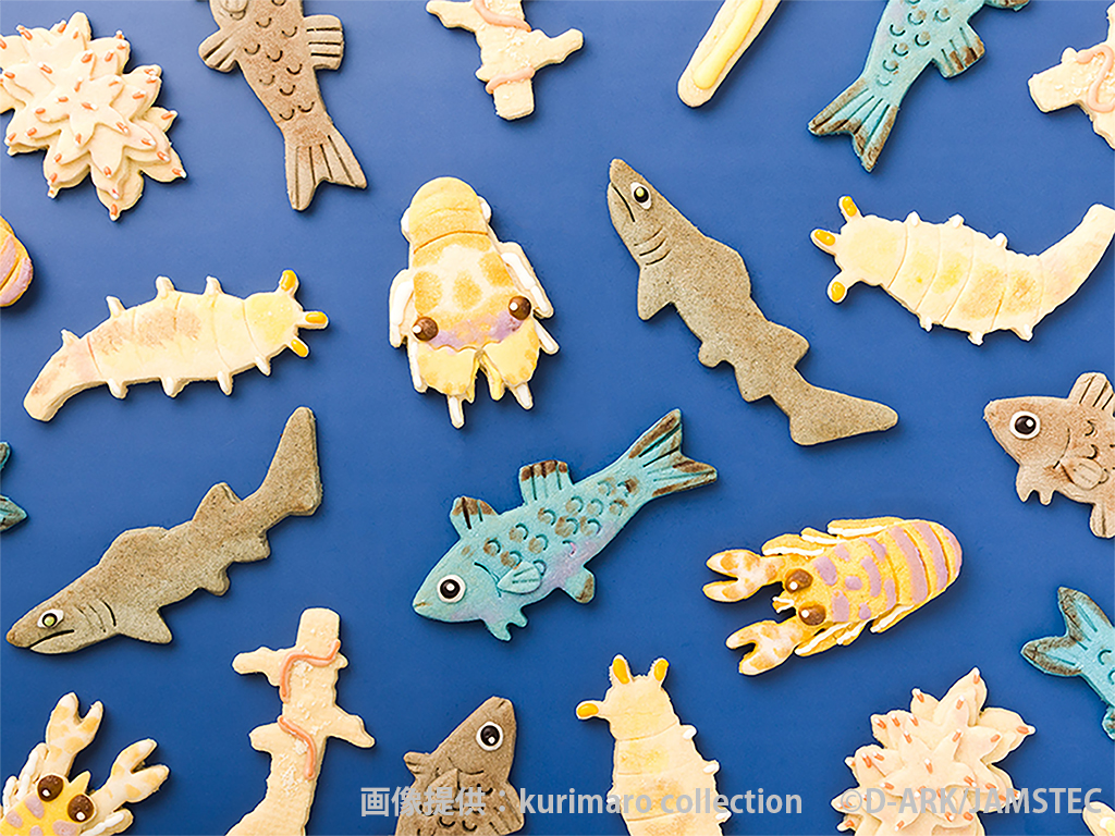 D-ARKの調査で発見した新種「ダイトウヒメクマノアシツキ」「ダイトウキノボリヒモムシ」や希少種「ホラアナヒスイヤセムツ」などのクッキーを製作いただきました。