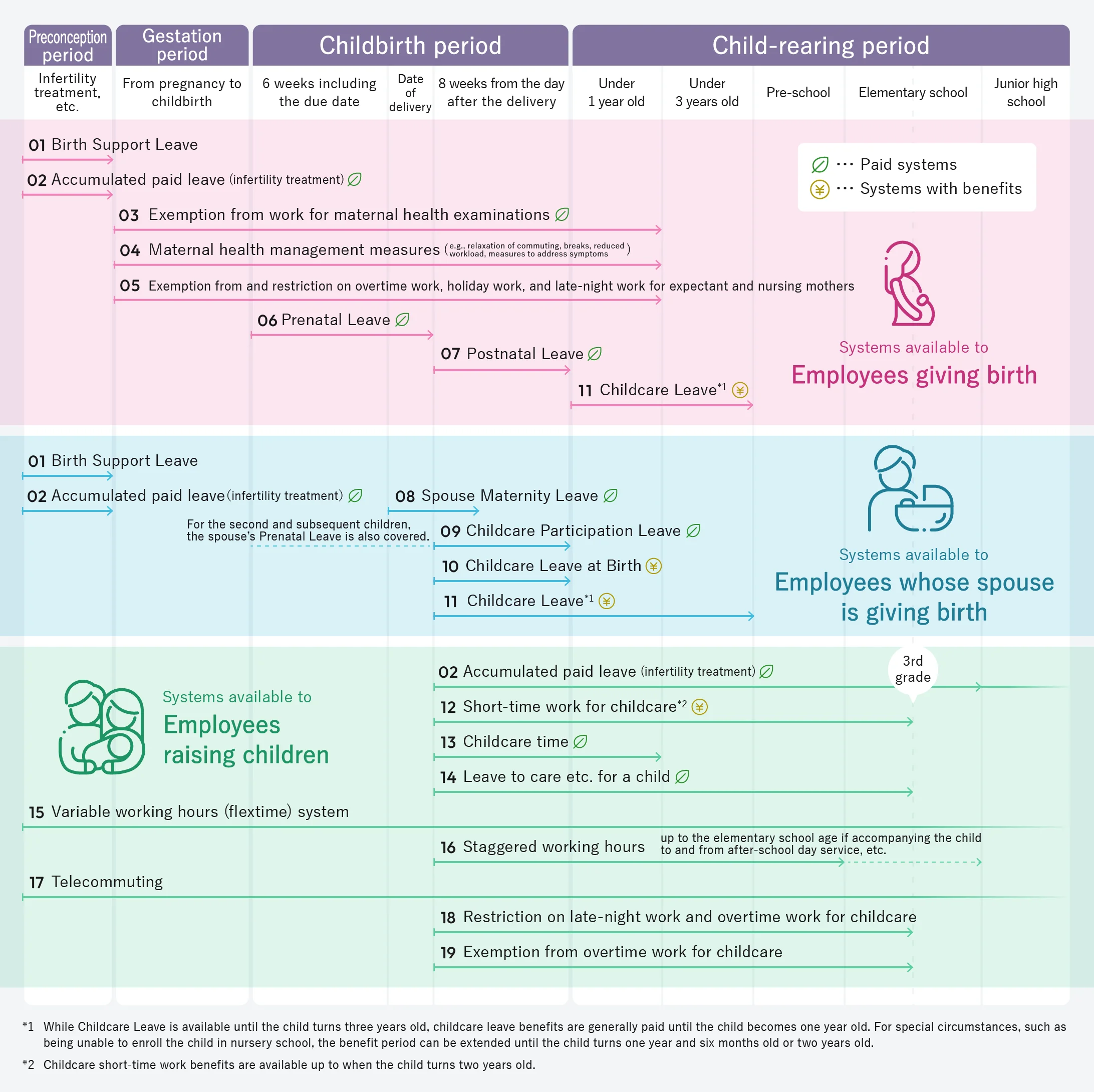 To protect maternal health, by making an application and based on their doctor’s guidance, employees can use various measures such as relaxation of commuting up to one hour per day, extended or more frequent breaks, shorter working hours, leave, and measures to address symptoms.