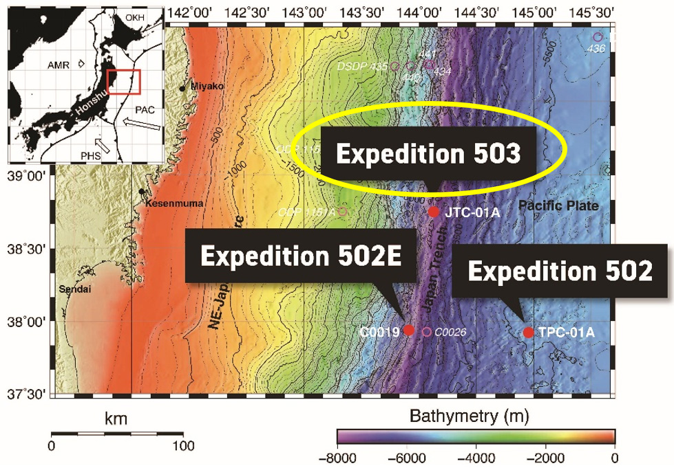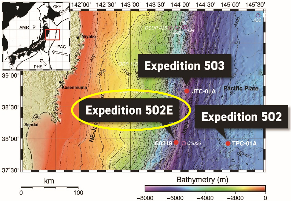 International Ocean Drilling Programme (IODP3) Expedition 502 plans to drill and the outer rise area of the Japan Trench, where the sediment layer above the acoustic basement is unusually thin.
