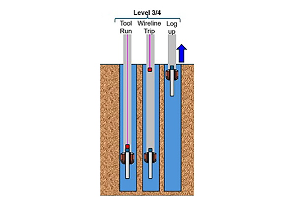 After landing the bit at the target depth within the borehole, logging was conducted (Tool Run). After confirming that the logging tool had landed directly above the bit, the wireline was released and retrieved aboard the vessel (Wireline Trip). Subsequently, logging was performed whilst raising the drill pipe (Log up). Following completion of measurements, the logging string was hauled in. During this expedition, three logging runs were conducted using different measurement tools.