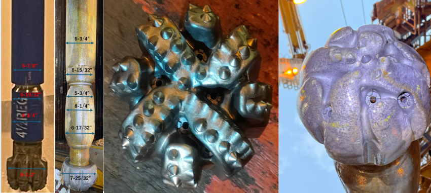 Photo 1. (4 November) The drill bit used during drilling Hole C0027C. The left images show the drilling bottom hole assembly (BHA) before (L) and after (R) drilling. The close-up images of the drilling bit show the cutting faces of the drill bit before (L) and after (R) drilling.