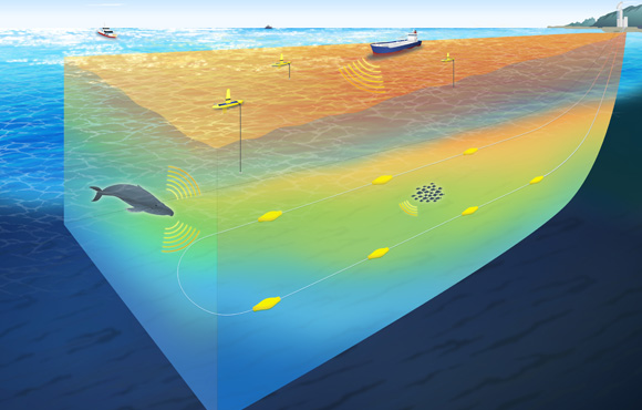 海洋の状況を経時的・一元的にモニターする技術が存在しないことを踏まえ、自動的な海洋データ取得と数値シミュレーションにより海洋環境の変化を把握し、さらに海洋音響の観測と解析により海上海中を通過する物体の移動様態等を把握するモニタリングシステムの技術開発を進めます。