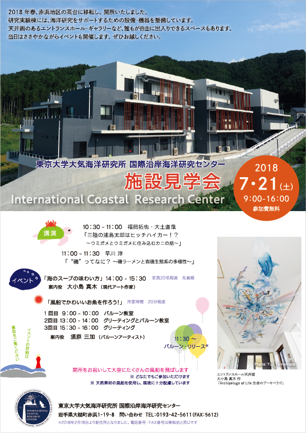 2018 年 2 月に、 岩手県大槌町赤浜の国際沿岸海洋研究センターが、 同じ赤浜地区内に再建されました。宅地予定地に隣接する場所に研究棟と宿泊棟を構え、2 018 年度内には、旧敷地内に水槽実験施設が再建され、研究成果の発信と交流を目的とした展示資料館「海の勉強室」が開設される予定です。
