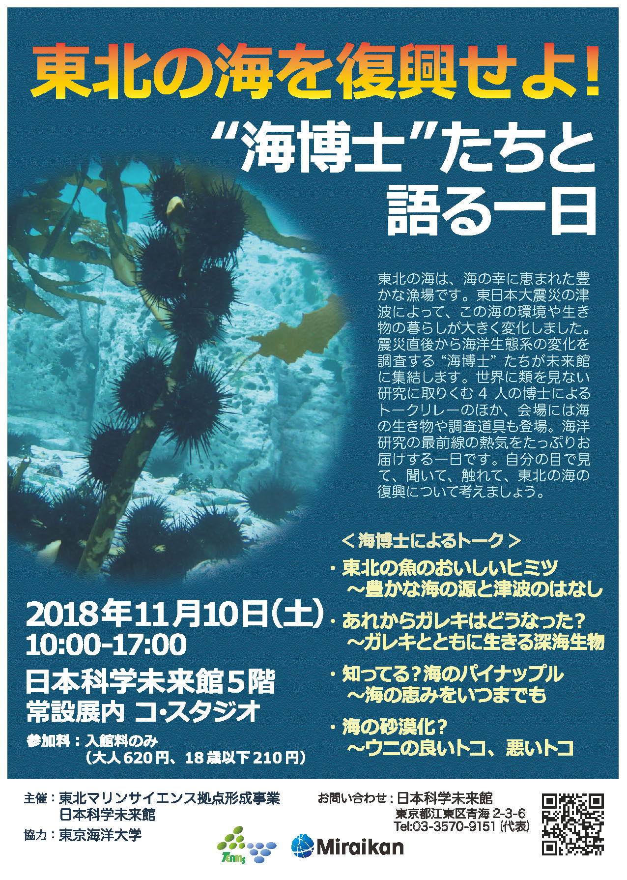 平成30年11月10日、日本科学未来館にて「東北の海を復興せよ! - "海博士"たちと語る一日」を開催しました。