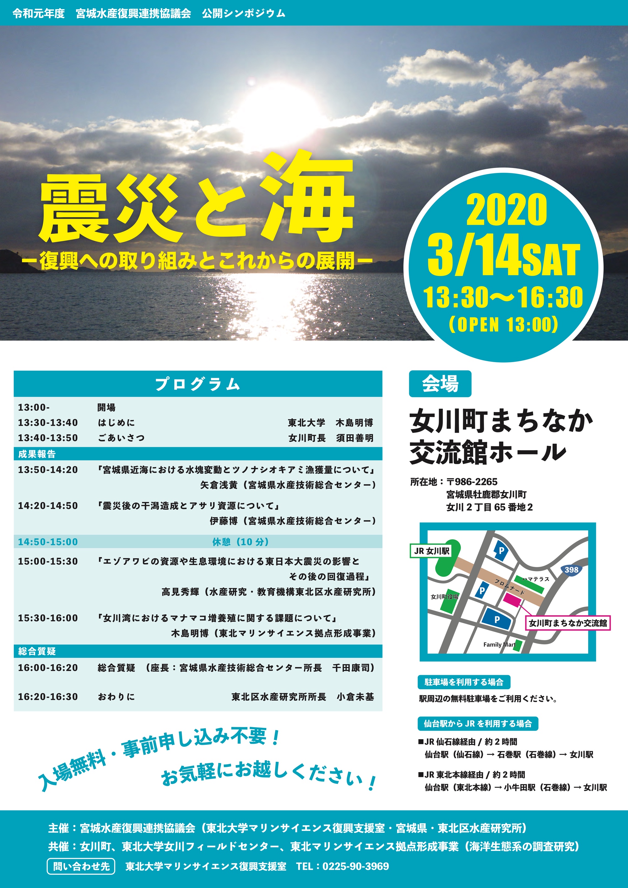 宮城水産復興連携協議会主催公開シンポジウム 「震災と海 -復興への取り組みとこれからの展開-」を開催します。