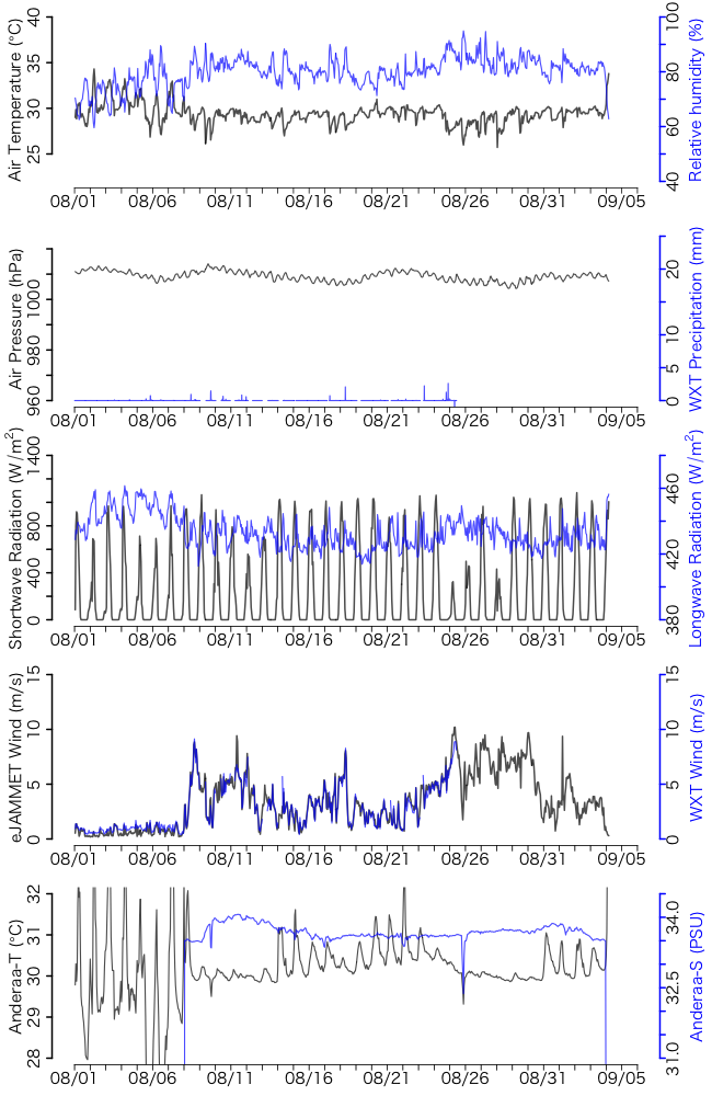 観測日数 28日 風向風速(JAMMET) 100.0% 風向風速(Weather Transmitter) 55.9% 気温 100.0% 相対湿度 100.0% 大気圧 100.0% 雨量 55.9% 短波放射 100.0% 長波放射 100.0% 海水温 100.0% 電気伝導度 100.0%