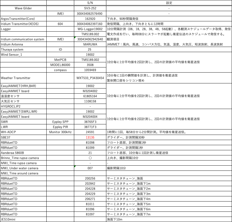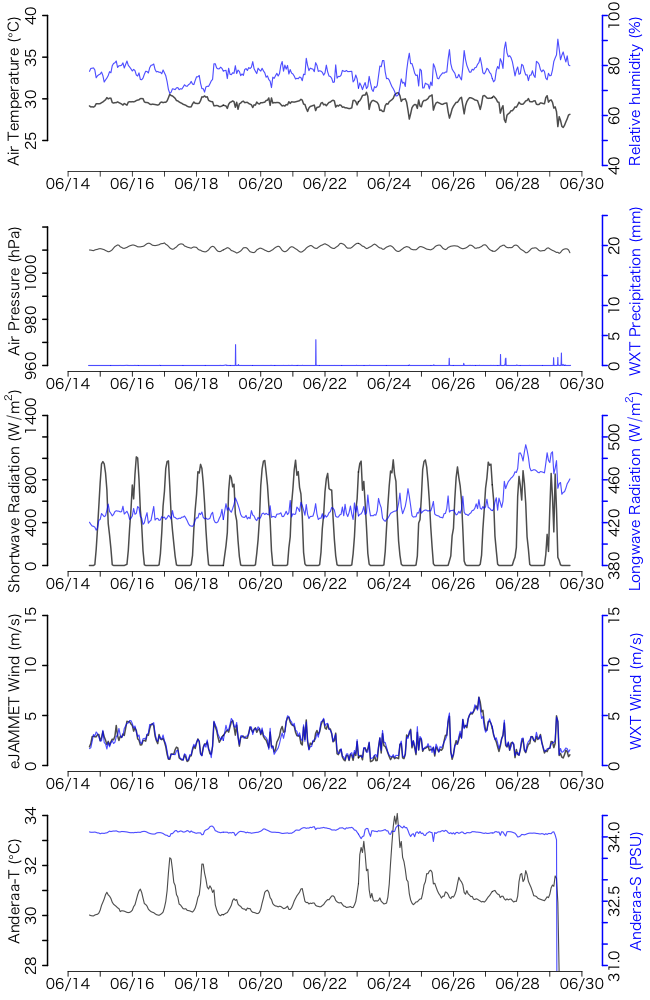 観測日数 15日 風向風速(JAMMET) 100.0% 風向風速(Weather Transmitter) 100.0% 気温 100.0% 相対湿度 100.0% 大気圧 100.0% 雨量 100.0% 短波放射 64.9% 長波放射 64.9% 海水温 100.0% 電気伝導度 100.0%