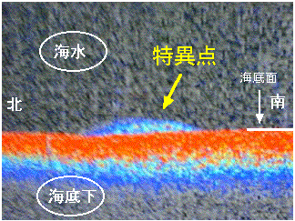 本日6時25分から実施した地形調査で得られたデータです。 赤が強い反射で白・青と順に弱くなります。この絵は北から南へぬけた 際のもので赤く平坦な海底に、青─白の高まりが南北440mで 認められました。これは高まりのサイドエコーも含まれています。