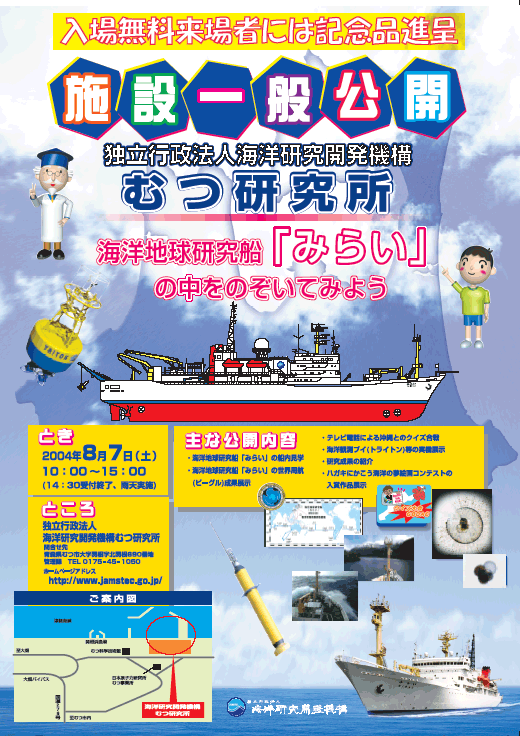 独立行政法人海洋研究開発機構(理事長 加藤康宏)むつ研究所(所長 深澤理郎)は、研究所の研究活動を広く地域の皆様にご理解して頂くため、下記のとおり海洋地球研究船「みらい」・むつ研究所の施設一般公開を実施しますのでお知らせいたします。
