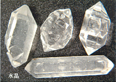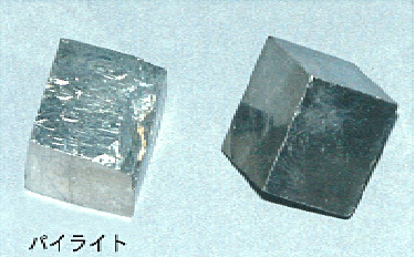 常温常圧で安定な石英(水晶)の結晶(六角柱状)とパイライトの結晶(サイコロ状)。