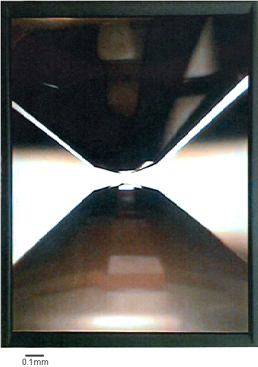 二つに対向するダイヤモンドの先端で、試料を超高圧へ加圧する。