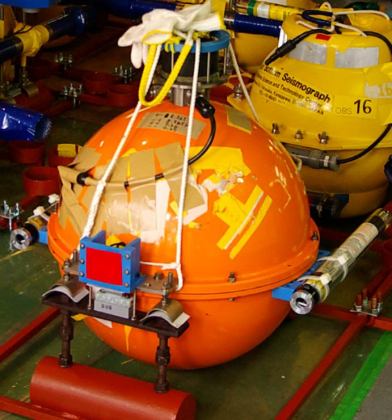 長期型海底地震計(橙色の球体)