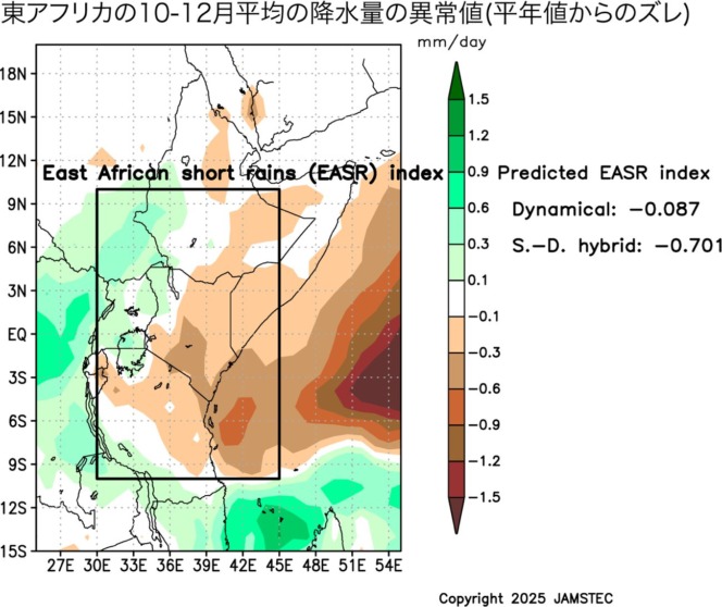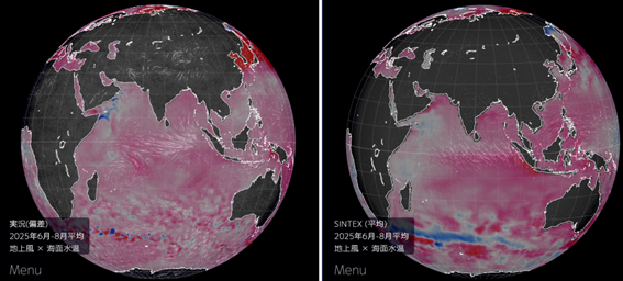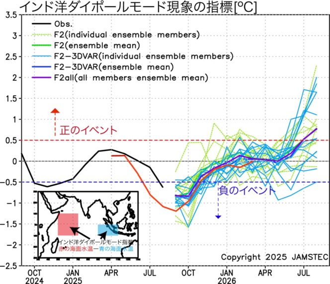 スーパーコンピュータ「地球シミュレータ」を使ったアプリケーションラボの季節予測システムでは、今夏、負のインド洋ダイポールモード現象(※1)が発生すると予測していました(2025年4月17日既報)。最新の観測データにより、実際に、負のインド洋ダイポールモード現象が発生したことが確認されました(図1)。最新の予測によると、この負のインド洋ダイポールモード現象が、今後更に発達し、秋に最盛期を迎えそうです(SINTEX-Fウェブサイト)。世界中の多くの予測システムでも、同様の予測が示されています(米国NMME,韓国APEC Climate Center, 豪州BoM)。