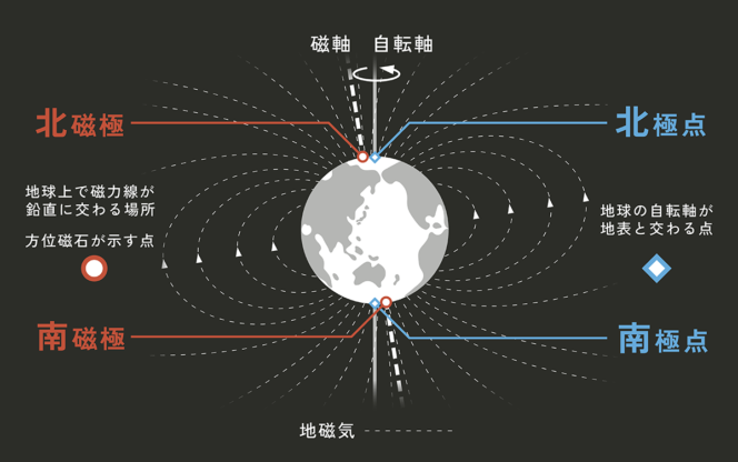地磁気は、地球磁場のことです。地球の南の磁極(南極ではない)をつむじとしたら、そこから北の磁極(北極ではない)に向かって地球の外を取り巻くように磁気が流れています。