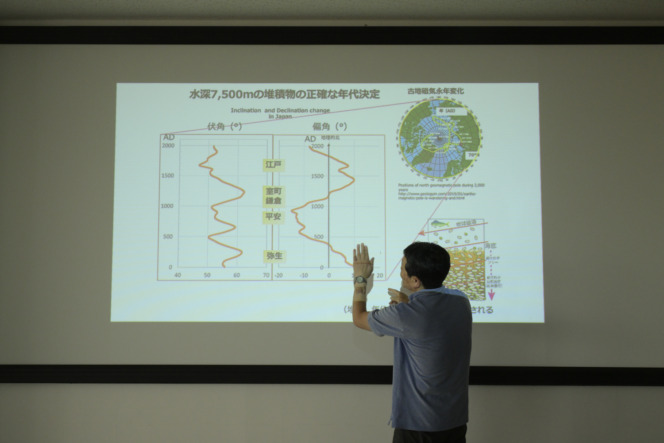たとえば、東北地方太平洋沖地震を起こした「日本海溝」の堆積物は、過去の地震をよく記録しています。しかし、水深が7500メートル以上あるため、有孔虫による放射性炭素年代測定は難しい。そこで、地磁気を分析することによって、堆積物の年代を知ることができるんです。