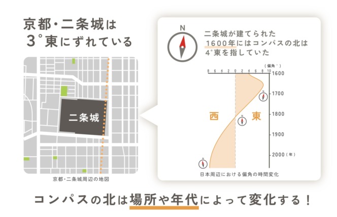 日本の地磁気と年代の対応が比較的明瞭な期間については、もう年表ができています。おもしろい話があって、京都の碁盤の目のような道は平安京がつくられた時代の北極星(真北)にもとづく東西南北に沿っています。しかし、二条城は、舶来品としてコンパスが入ってきた1600年頃にコンパスで北を決めて建てられたから、道から3度ほどずれているという説もあります。