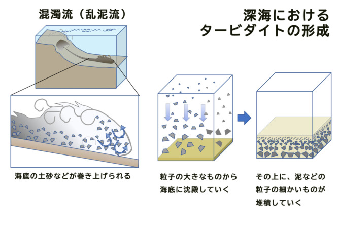 まず、津波や地滑りなどによって、海底の斜面にたまっている泥がモアッと巻き上がります。このとき濁った水は周囲の水より重いため斜面から流れ落ちます。これを混濁流といいます。この混濁流が海底に積もると、粒子が大きいものから先に沈み、泥のような細かい粒子はその上に積もります。このような地層がタービダイトです。