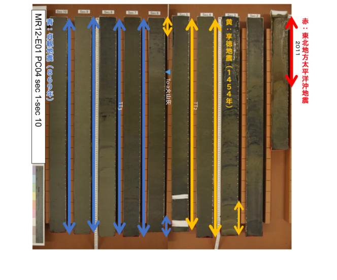 はい。我々が見ていない地震なので、古文書と突き合わせてちゃんと整合性を確かめることは大事です。東北沖のコアは10メートル採っても2000~3000年分ぐらいの地層しか含まないので、869年の貞観地震など、いくつか記録に残っている地震と照合できました。