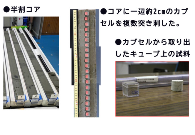 まず、採取したコアは、半分に割られます。これは「半割(はんかつ)コア」と呼ばれます。一方は保存用のコアとなり、もう一方は、試料として研究に使われます。