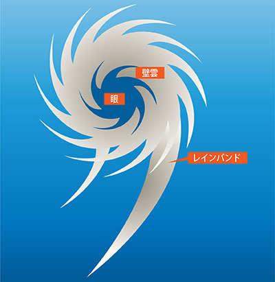 はい。では、なぜ台風の強風域が拡大するのか。その理由を明らかにするため、データの解析と同時進行で、台風の構造に関する論文を毎日読みあさりました。最低1日1本。そうした中で、ある論文を見つけました。それは、台風の中心に向かって伸びる積乱雲の列「レインバンド」(図4)の研究でした。雲ができるときに生じる潜熱で空気が温められて雲の下の気圧が下がることが報告されていて、それを読んだ瞬間に「これだ!」とひらめきました。