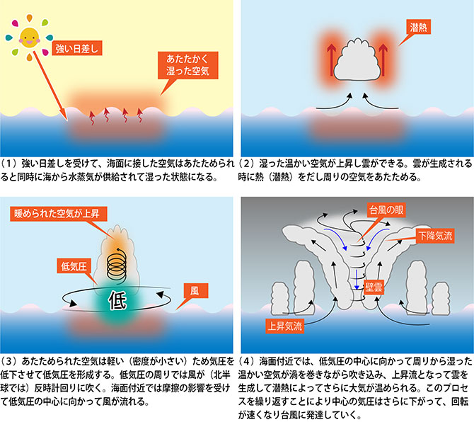 まず台風の発生メカニズムから話します(図5)。日本では、海面水温が温かい熱帯の海上で発生し、強く発達した熱帯低気圧のことを台風と呼びます。大ざっぱな説明となりますが、強い日差しで暖められた海面に接する空気は、暖められて気温が上昇すると同時に、海から水蒸気を供給され湿った温かい状態になります。この湿った温かい空気が上昇し雲ができます。雲が生成される時に熱(潜熱)をだし周りの空気を温めます。温められた空気は軽い(密度が小さい)ため気圧を低下させて低気圧を形成します。低気圧の周りでは等圧線に沿って風が(北半球では)反時計回りに吹きます(等圧線の間隔が狭くなると風は強くなります)。海面付近では摩擦の影響を受けて低気圧の中心に向かって風が流れます。海面付近では、低気圧の中心に向かって周りから湿った温かい空気が渦を巻きながら吹き込み、上昇流となって雲を生成して潜熱によってさらに大気が温められます。このプロセスを繰り返すことにより中心の気圧はさらに下がって、回転が速くなり台風に発達していきます。
