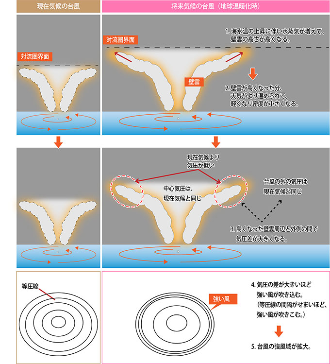 台風の発生メカニズムで触れましたが、雲が生成される時に潜熱で空気が温められます。シミュレーションでは地球温暖化によって海から供給される水蒸気が増えることで、台風の壁雲が高くなることがわかりました(図6上)。このことにより現在気候よりも将来気候では潜熱がたくさん供給され空気が温められるので、レインバンドと同様、空気が軽くなって気圧が下がった状態になります(図6中)。一方、台風の外の気圧は、現在気候とほとんど変わりません。低気圧の周りでは等圧線に沿って反時計回りに回転した風が吹いています。等圧線の間隔が狭い場合に風は強くなります。台風の中心の気圧が同じ場合で現在気候と将来気候の台風の周りの等圧線を比べると、台風の中心と周りの気圧が同じであったとしても、雲が生成される領域(壁雲)付近では将来気候の方が気圧が低下しているので外側では等圧線の間隔は狭くなり、風は強くなります(内側では逆になる)。こうして台風から離れたところでも風が強くなるので強風域が拡大する、というわけです(図6下)。