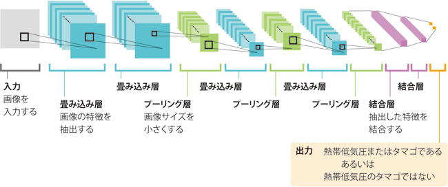 杉山:まず、入力した雲画像が熱帯低気圧のタマゴか、タマゴではないかを識別する識別器をつくる必要があります。識別器は、画像の特徴を抽出する「畳み込み層」と画像サイズを小さくする「プーリング層」、抽出した特徴を結合する「全結合層」から構成されるのですが、それぞれの数や順番など、いろいろなパターンが考えられます。今回は、膨大な組み合わせの中から最適なパターンを、コンピュータを用いて探索しました。