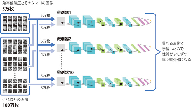 松岡:熱帯低気圧とそのタマゴの雲画像5万枚を、10台の識別器に学習させます。熱帯低気圧に発達しなかった雲画像は5万枚ずつ10セット作成し、各識別器に学習させます。これで、少しずつ性質の違う識別器ができました。