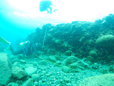 水中構造物の調査の様子地殻変動を記録した構造物や、災害の伝承が残された遺跡を調査・測定し、これらの数値定量化を進めるとともに過去の災害規模の推定を目指し、また遺構の保存や災害教育への利用をおこなっています。 |