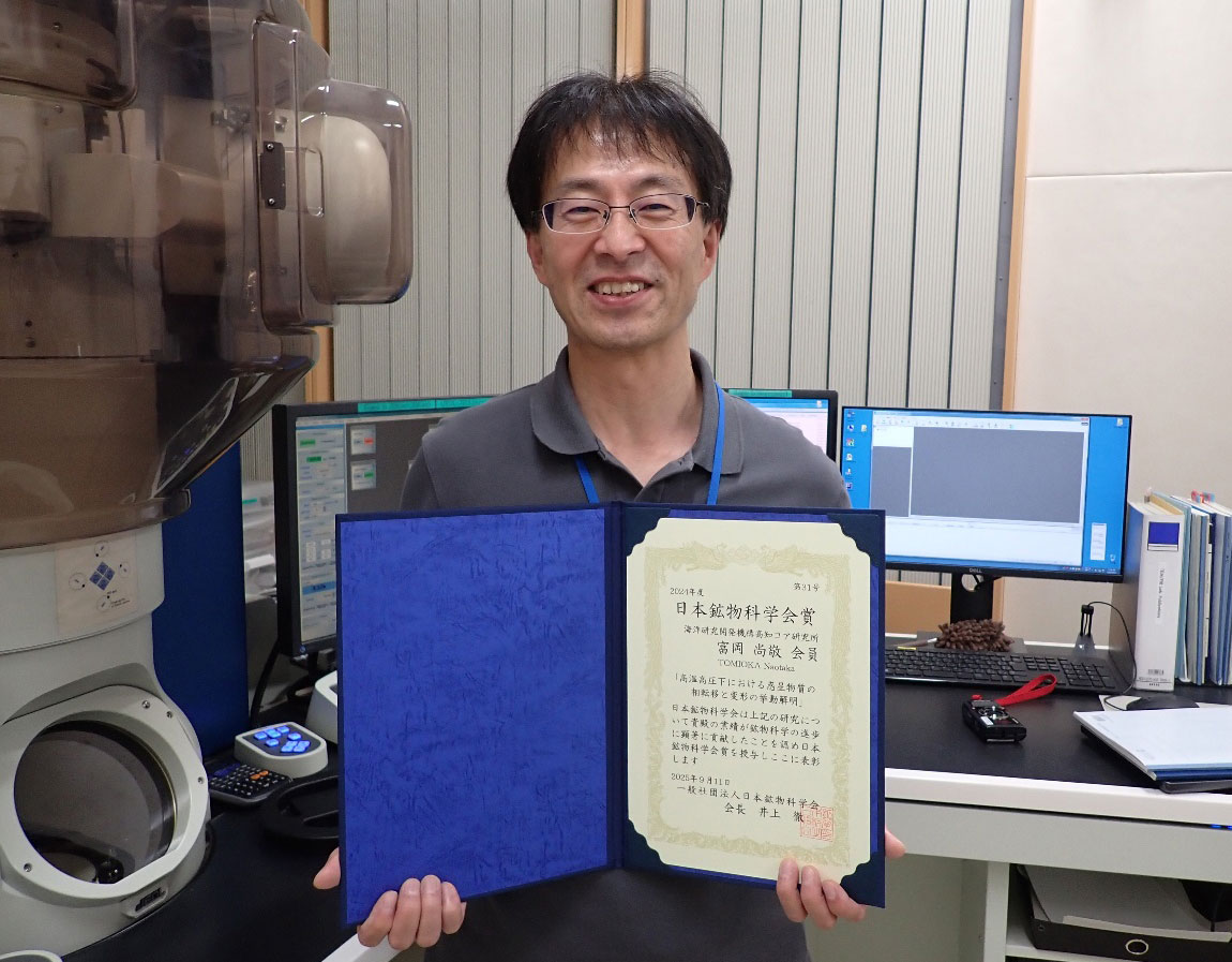 富岡尚敬上席研究員が2024年度日本鉱物科学会賞を受賞し(受賞題目:高温高圧下における惑星物質の相転移と変形の挙動解明)、2025年9月11日に山口大学で開催された⽇本鉱物科学会2025年年会・総会で表彰されました。