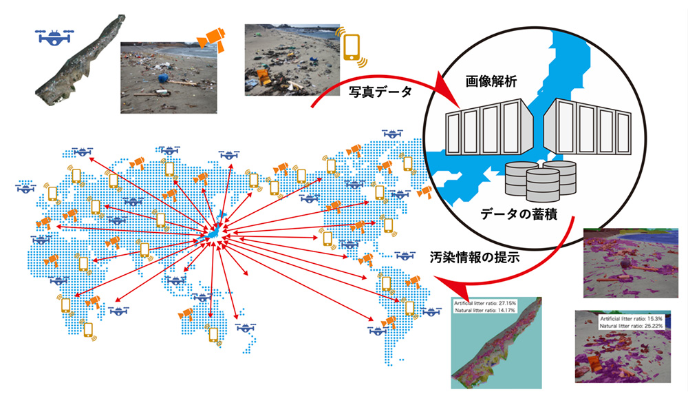 海岸漂着ごみによる汚染状況を定量化する画像解析AIを利用可能なWebサービスです。これまで、海岸漂着ごみのモニタリング手法は国・地域レベルで統一化されておらず、地域間の比較を行うことが困難でした。BeachLISAを使うことにより、スマートフォンやドローンを用いて撮影した海岸の写真から漂着ごみの量や種類を自動推定することができます。誰もが容易に利用可能なサービスとして、海ごみモニタリングの国際基準を定めたガイドラインにも掲載されています。今後、国内外で協調した海ごみモニタリングと汚染状況の「見える化」を推進し、環境保全や政策立案への貢献を目指しています。