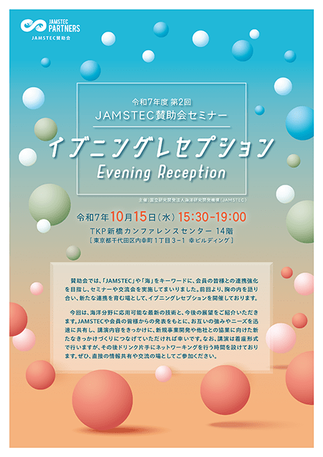 賛助会では、「JAMSTEC」や「海」をキーワードに、会員の皆様との連携強化を目指し、セミナーや交流会を実施してまいりました。前回より、胸の内を語り合い、新たな連携を育む場として、イブニングレセプションを開催しております。