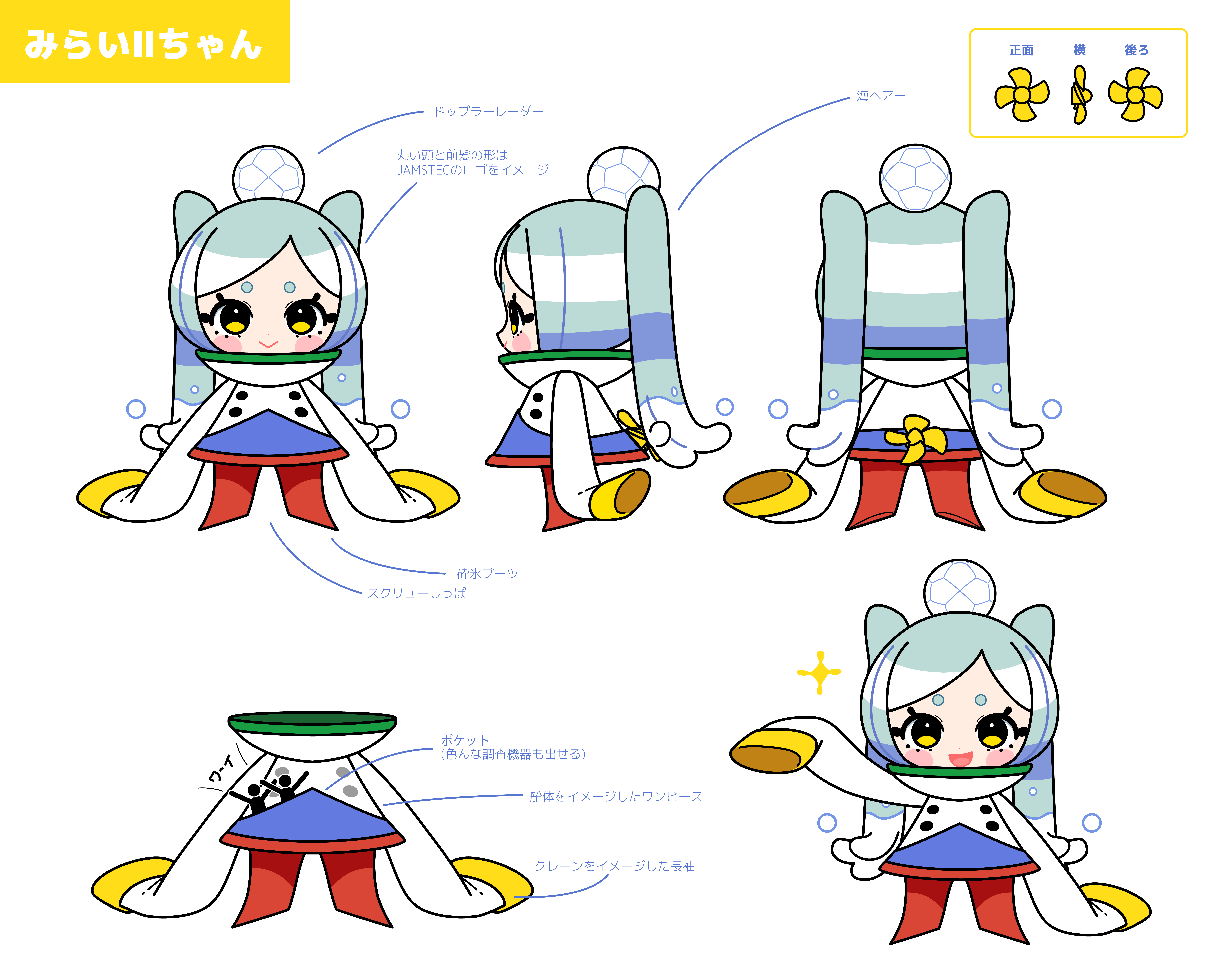 キャラクターに「みらいⅡ」の特徴的なものを取り込んで、見た目からも船自体のことを少しでも知ってもらえるようなキャラクターを目指してデザインしました。あとは子供から大人の方まで親しみやすさを意識してみました。