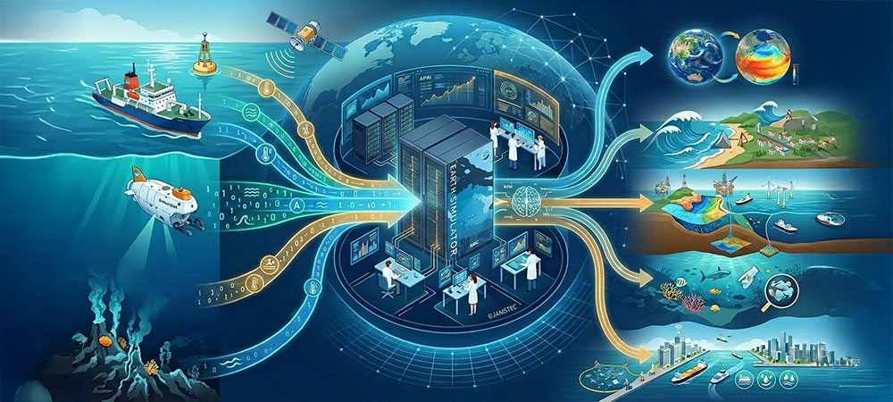 海洋・地球・生命と人間活動が複雑に影響し合う地球システムを、観測・分析データと先端シミュレーションを統合してデジタル空間に再現し、将来変動の予測と社会課題の解決に資する「海洋地球デジタルツイン」の構築を推進します。物理・化学・生物過程の変化や相互作用を精密に表現する情報地球科学を基盤に、データ科学、数理科学・計算科学を横断的に活用、得られた知見を具体的事例へ適用し、科学的根拠に基づく付加価値の高い情報として効率的に発信します。