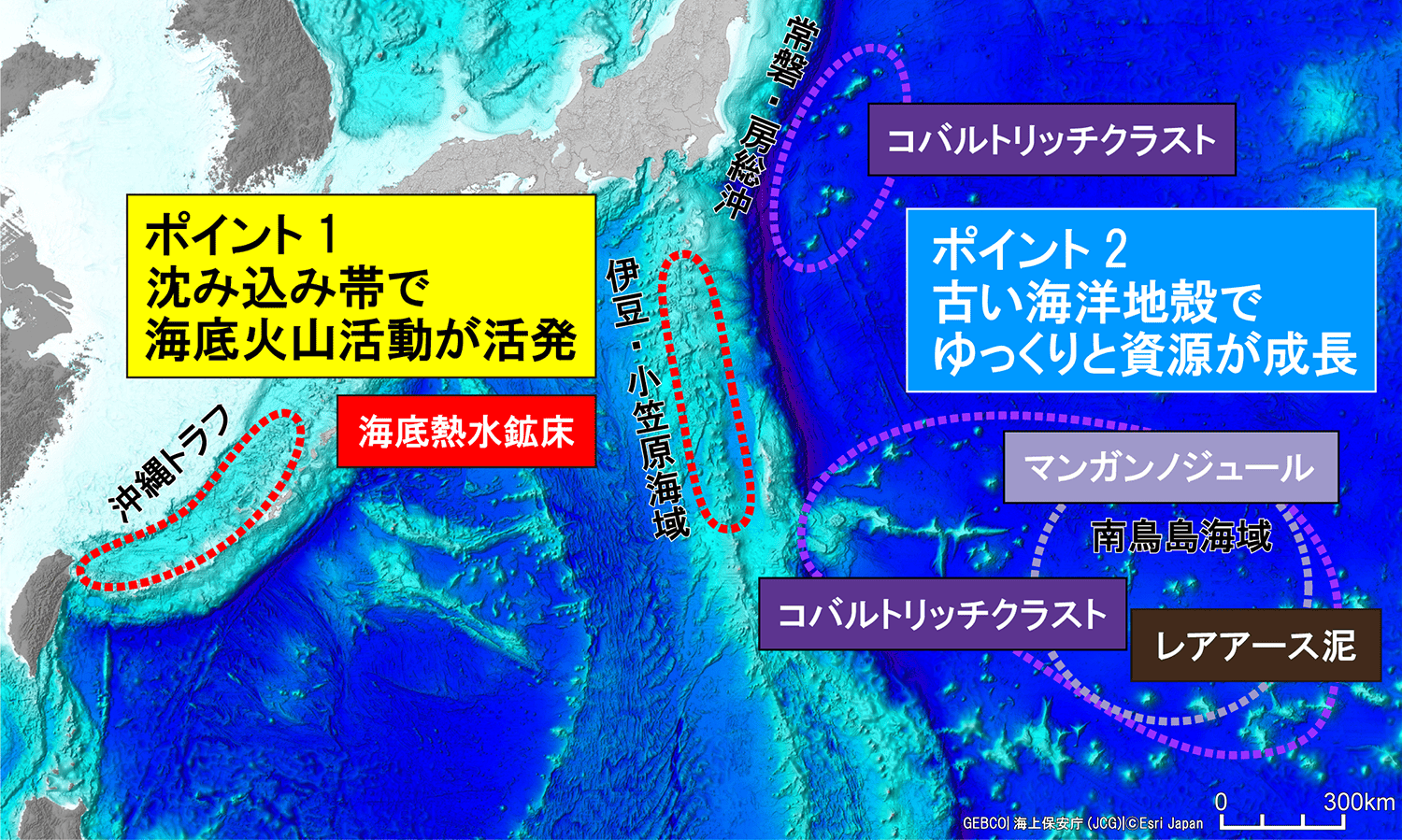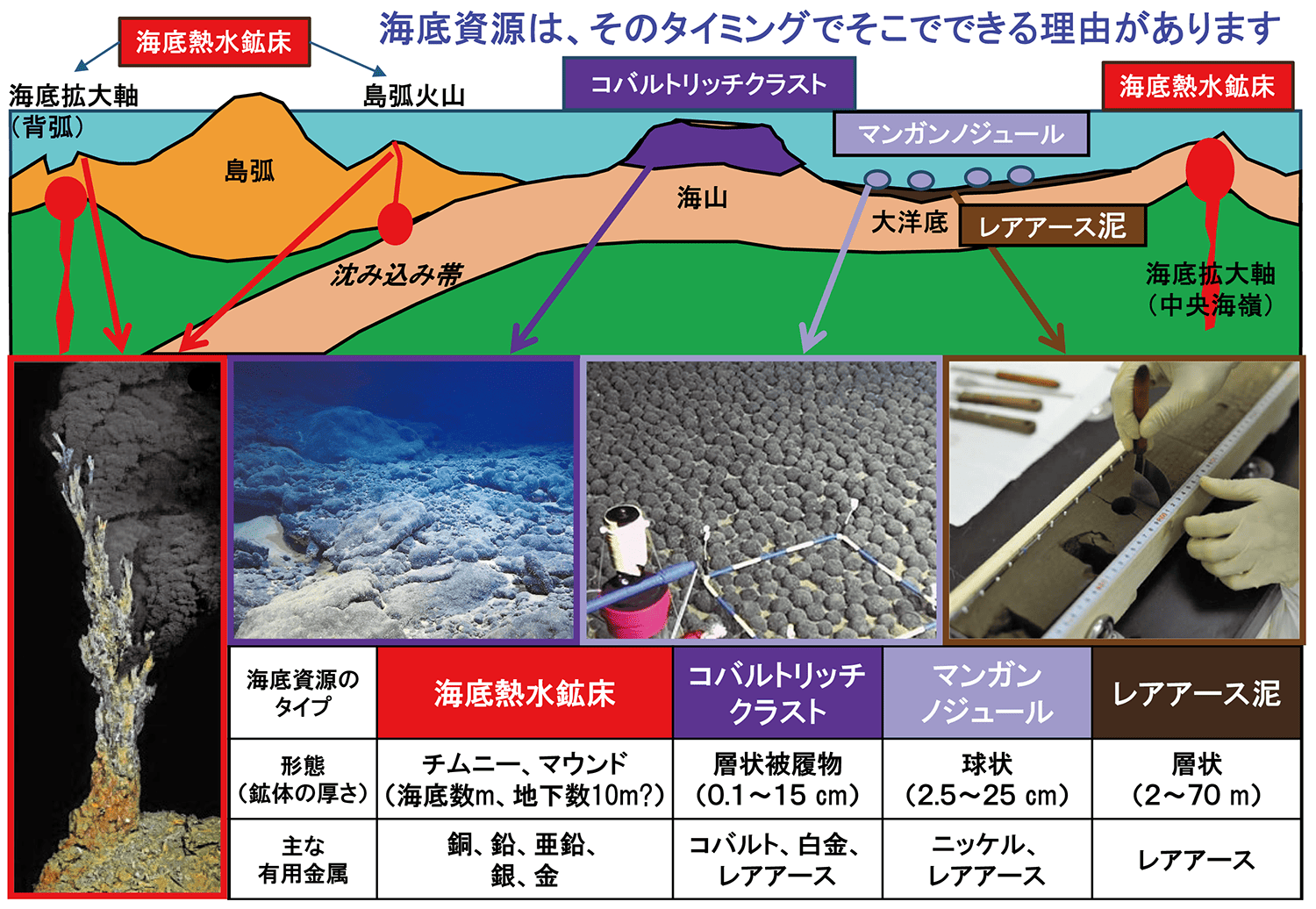 海底地形図を覗いてみましょう(図1)。日本列島は、北半球の中緯度、ユーラシア大陸の東縁に位置し、その周りをプレートの沈み込み境界に取り囲まれています。目につくのは、日本海溝、伊豆マリアナ海溝そして南海トラフといった深い溝状の海底地形です。これらはプレートの沈み込みに伴ってできた海溝と呼ばれるものです。海溝に沿ってプレートが日本列島に沈みこむことで、巨大地震が起こり、火山が噴火するなど、日本は地球上で最も地殻変動が激しい場所の一つとされています。このような地震や火山は何も陸上だけに起こるのでなく、例えば、沖縄トラフや伊豆小笠原海域と呼ばれる海底においても海底火山が噴火を起こしています。これら海底火山によって熱せられた水が岩石から金属を溶かしだします。こうして銅や鉛、亜鉛や金などの有用な金属を含む熱水が地下の深い場所から移動して海底の浅いところで冷やされて海底熱水鉱床となり、海底下に分布しています(図1と2)。