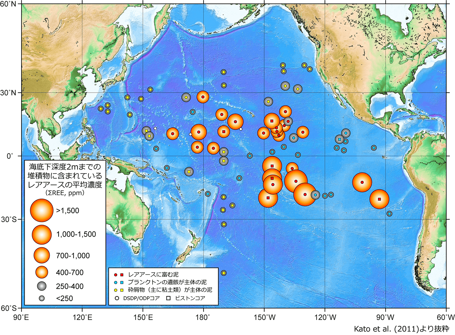 貴重な資源としてのレアアースは、現在その全てが陸上の鉱山から産出されています。しかし、今,海のレアアースが注目されています。90年代後半から、大陸からはるかに離れた水深5,000mを超える太平洋の深海底を覆う泥質の堆積物(遠洋性堆積物)中にレアアースが濃縮されて含まれることが明らかにされてきました(図3)[1] [2]、研究が進展するにつれ、その存在は、太平洋だけでなく、インド洋などを含む[3]、深海底を覆った世界中の遠洋性堆積物中に含まれていることが分かってきました[2]。このレアアースに富んだ堆積物を「レアアース泥」と呼びます[2]。ただし、同じようにみえる遠洋性堆積物中の中でもレアアースの含有量については必ずしも一様でなく、海域によって、また堆積した地質時代によって、その含有率にバラつきがあることが分かってきました[2][3]。そのなかでも、南鳥島周辺の日本のEEZ、水深5,000m以深の堆積物のレアアースの含有量が高いことが知られるようになりました[4]。