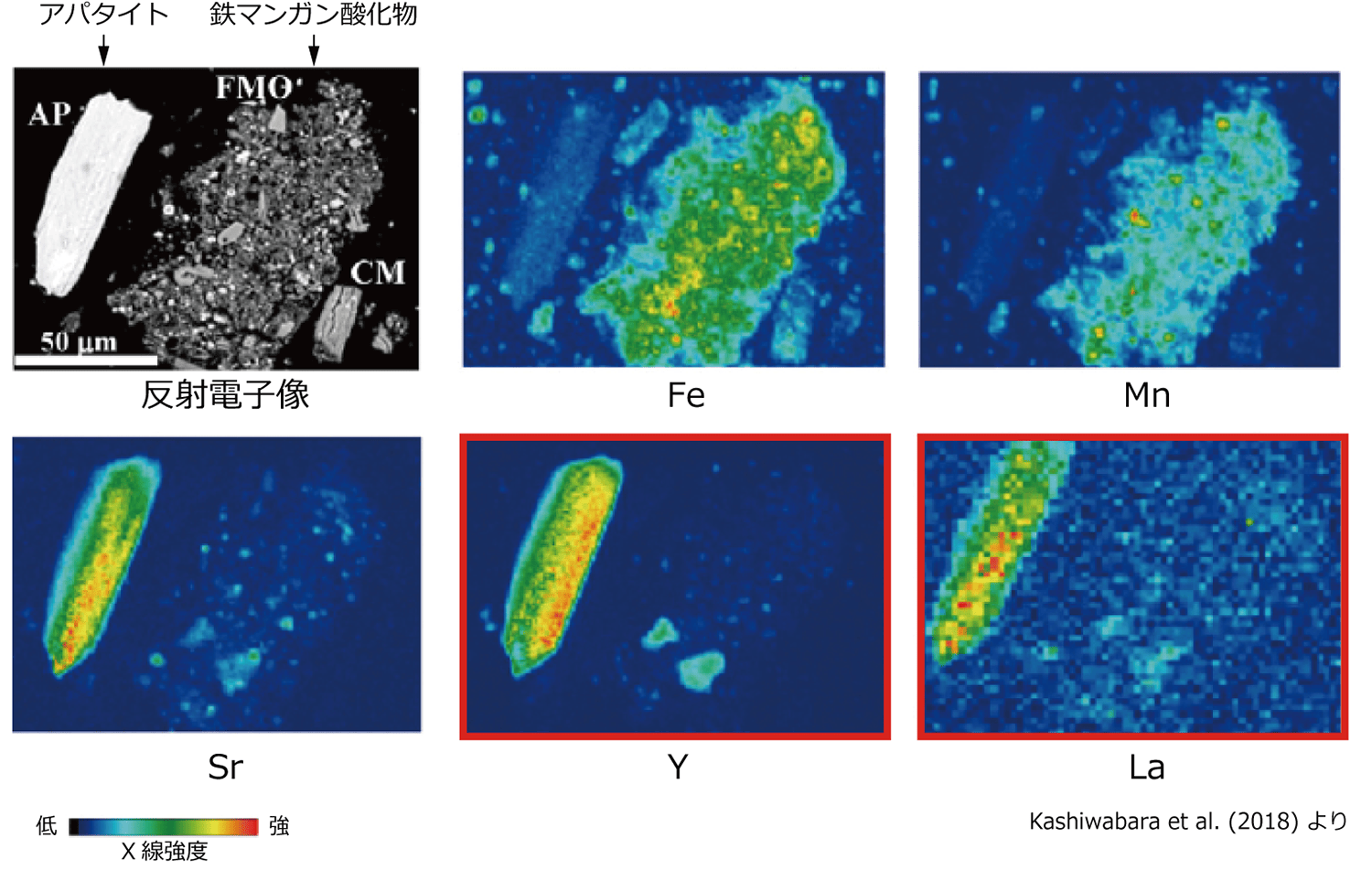 放射光-蛍光X線分析による元素マッピング:左上のアパタイトの大きな粒子に、イットリウム(Y)やランタン(La)といったレアアースが含まれている。レアアース以外に、ストロンチウム(Sr)がアパタイトに濃集しているが、これはストロンチウムがカルシウム(Ca)と化学的に似たような挙動をするためです。