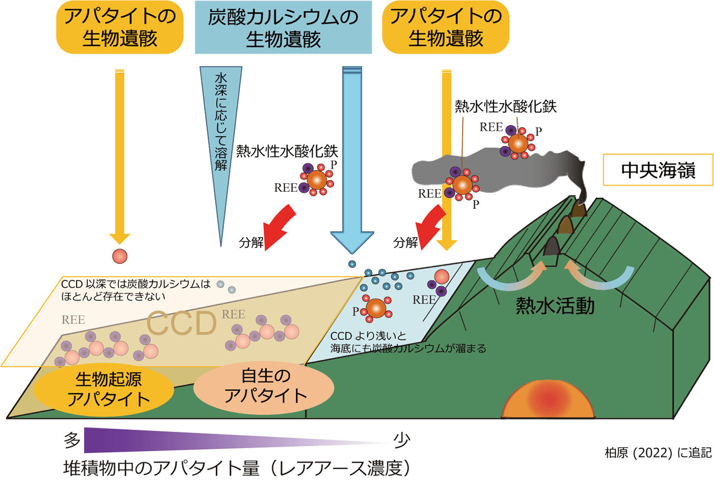 レアアース泥が陸に近い海や浅い海ではなく、南鳥島周辺のように陸から遠く離れた深海に存在していることにも理由があります。陸に近い海では河川や風によって供給される砂や泥が多く、また炭酸カルシウムでできた海棲の生物の殻や遺骸がたくさん堆積します。従って、近海では、陸地や海棲生物などからもたらされる大量の堆積物によって、アパタイトが希釈されて薄まってしまうために相対的に堆積物中のレアアースの濃度が低くなってしまいます。逆に、太平洋の遠洋性堆積物の場合、陸域から離れていることで風塵のような風成の堆積物が少ない上に、水深4,500mを超えると、水圧により炭酸カルシウムが海水中に溶解してしまいます(この水深を炭酸塩補償深度といいます)。そのため、炭酸カルシウムからなるプランクトンなどの殻は水中に溶けてしまい堆積物に入らないため、浅海域で見られるようなレアアースの希釈効果もなくなってしまいます。結果として、深海底ではレアアースが濃縮したレアアース泥が形成されることになります(図5)[10]。