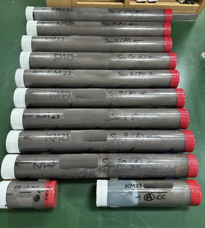 その結果、高精度音響探査データが少なかった初期には、レアアース泥は水平に層をなし均質な厚さで広く分布すると考えられていましたが [16]、実際に得られたデータでは、海底下のレアアース泥の水平方向の広がりは決して均質ではなく凹凸に変化し、ときには、侵食され、海底下のレアアース泥層の深度や層の厚さも側方に複雑に変化することが分かりました。つまり、正確な資源量の把握や開発可能な場所を絞り込むためにも、海底下に分布する泥の層の側方変化を詳細に調べ、多くのピストンコアを採取し確認する必要があることが分かりました。このために、SIP海洋プロジェクトでは、有望海域において高解像度の音響探査を実施するとともに緻密な地点間隔でのピストンコア採取を行なってきました。こうして得られたデータを用いて、産業技術総合研究所、京都大学、高知大学などと共同でレアアース泥の三次元的な形状やレアアースの分布を地球統計学に基づくモデルを構築し正確な資源量の推定にも取り組んでいます。この取り組みに基づき、堆積層の丁寧な分類など堆積構造の解析結果や多くの試料での化学分析の結果を含めてみると南鳥島周辺の海域にはネオジムやジスプロシウムなどの有用な中重希土類に富み、十分に産業的規模の開発ができる資源量があることが確認できました。しかし、具体的な資源量や場所、品位などについての仔細については経済安全保障上の理由で公開を控えております。