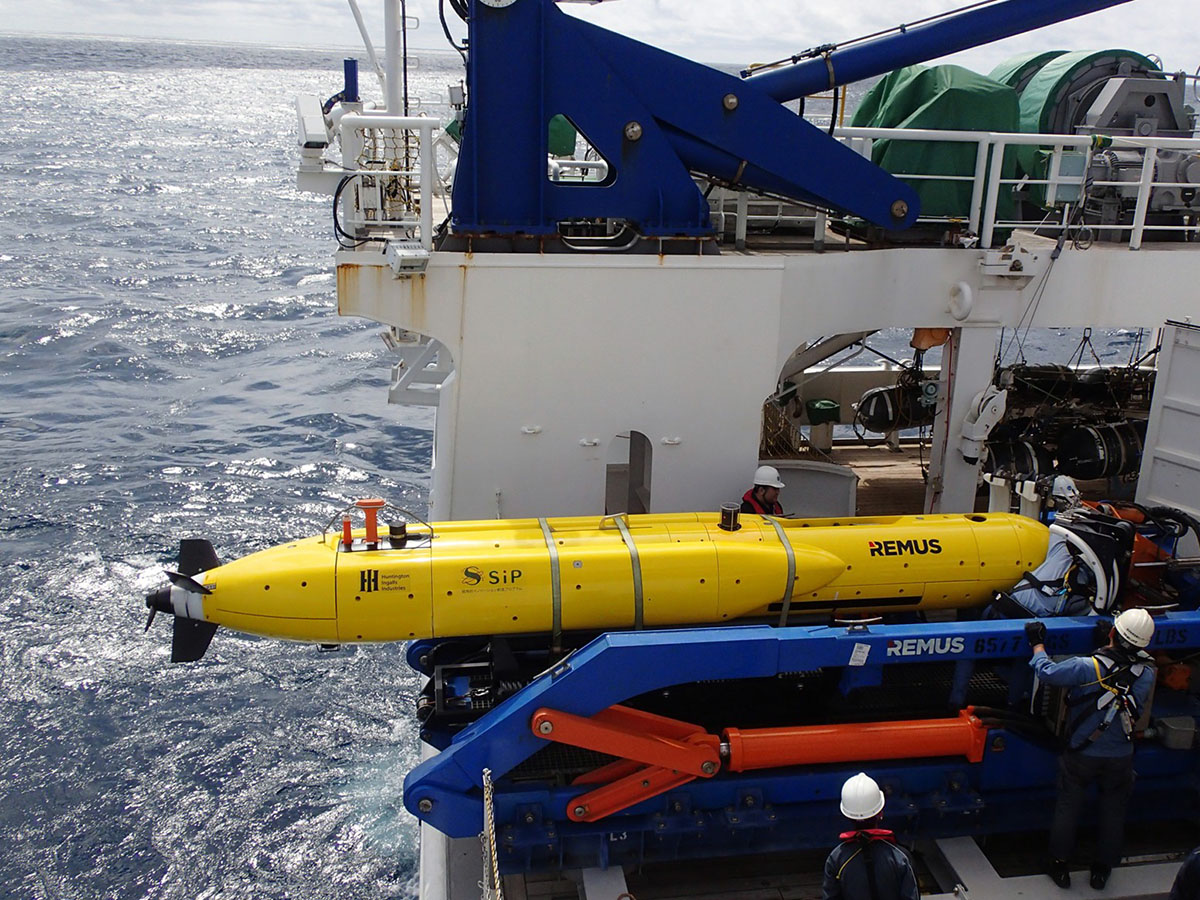 海洋の場合は、基本的には、陸域のそれに準じた方法を取ることになりますが、水中は光が届かず、電波が通じない暗黒の世界です。このため、踏査による地質調査、物理・電気探査ができませんので、代わりに音波による高解像度音波探索を行うことになります。但し、音波は電波と比べて伝わる速度が著しく遅いので、信号音が水中を伝わるだけでも時間がかかります。例えば、水深5~6,000mでは、洋上の調査船舶から音源を出し海底面から反射し帰ってくるまでに8秒もかかってしまいます。また、調査船舶から発射される音源は広く拡散するので、音波が海底で反射する際には、広がった音波からの反射による位置の誤差が大きくなってしまいます。従って、水深5~6,000mの深い海底を探査するには、船上からの高解像度音波探索では精度が著しく劣ることになります。その為に、SIP海洋プロジェクトでは、海底面に近い深海に測深器を曳航する深海曳航機もしくはAUV(自律型海中ロボット)を導入し、海底面からの高度数十〜200mを保ち、低速で走らせるなどの手法で音響探査を行なっております。実際には、自律型無人探査機(AUV「しんりゅう6000」、図7)を使った音響測器(サブボトムプロファイラー:SBPやサイドスキャンソナー:SSS)を利用した調査を進めています。これまでは調査船に装備されたSBPを用いて、レアアース泥の確認に向けた海底下の地層の調査は行われてきましたが [14]、AUVによる調査は空間分解能=地層構造の解像度が大きく改善されており、海底面下の地質構造調査技術を高度化した成果です(図8)[15]。