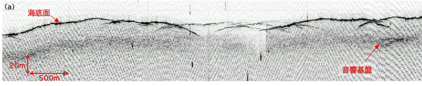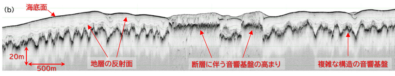 (a):海底広域研究船「かいめい」で取得した海底下の地層探査データ、(b):同じ測線をAUV「しんりゅう 6000」(海底面からの高度20m)が航走して得た地層探査データ。幅100mオーダーの凹凸地形を示す複雑な音響基盤や断層による音響基盤の高まり、細かな地層のつながりの様子がはっきりと確認できます。特に、レアアース泥の側方分布について、ピストンコア試料の採取点と併せて、音響基盤の上にある細かな反射面を使ってトレースでき、面的な広がりを知ることができる。