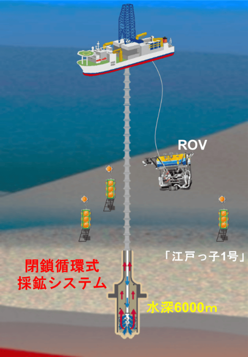 レアアース泥の開発における課題の一つには、超深海からどのようにレアアース泥を連続的に採鉱できるのかという採鉱システムがあります。これまでに、JAMSTECの地球深部探査船「ちきゅう」を用いて、レアアース泥採鉱を可能にする技術の研究開発に着手し、既に2022年5月には水深2,470mの地点における実海域試験による海底堆積物の揚泥試験には成功しております [17]。この試験で用いた採鉱装置は南鳥島海域水深約6,000mの海底下に存在するレアアース泥を採鉱することを念頭に設計されたものです。試験に使用する採鉱装置は、当初より環境に配慮した閉鎖系循環方式を採用した設計となっており、一般的に採鉱時に生成する堆積物プルーム(濁り)などの生成は極力抑えられる仕組みとなっています(図9、10)。いよいよ2026年1月に南鳥島の深海底から実際にレアアース泥を採鉱するためのパイプ接続を含めた採鉱システム全体の試験を南鳥島沖で行う予定です。同時に、試験期間には海洋環境への影響を評価するため、SIP海洋プロジェクトによって発行された国際標準(ISO)規格に則った[18]環境影響評価を実施します。環境影響評価については、事前(ベースライン調査)、採鉱試験中及び採鉱試験後の3つの時期にそれぞれ行うことになります。既に最初の採鉱試験前のベースライン調査として、「江戸っ子1号」などを使用した環境モニタリングの事前調査が実施されており、今回の試験では、実際の採鉱機器を動かしながらの環境影響評価の観測となります(図9)。このように、開発技術としての採鉱装置の設計の段階から環境への影響評価について配慮する研究開発を進めると共に、運用においては「環境配慮ガイドライン」の作成・検証や、また、ベースライン調査や採鉱試験中の観測、その後の観測などをしっかりと計画に組み込むなどしながら環境への影響をできる限り少なくできる「環境にやさしい」技術開発と運用の両面での研究開発を進めていきます。
